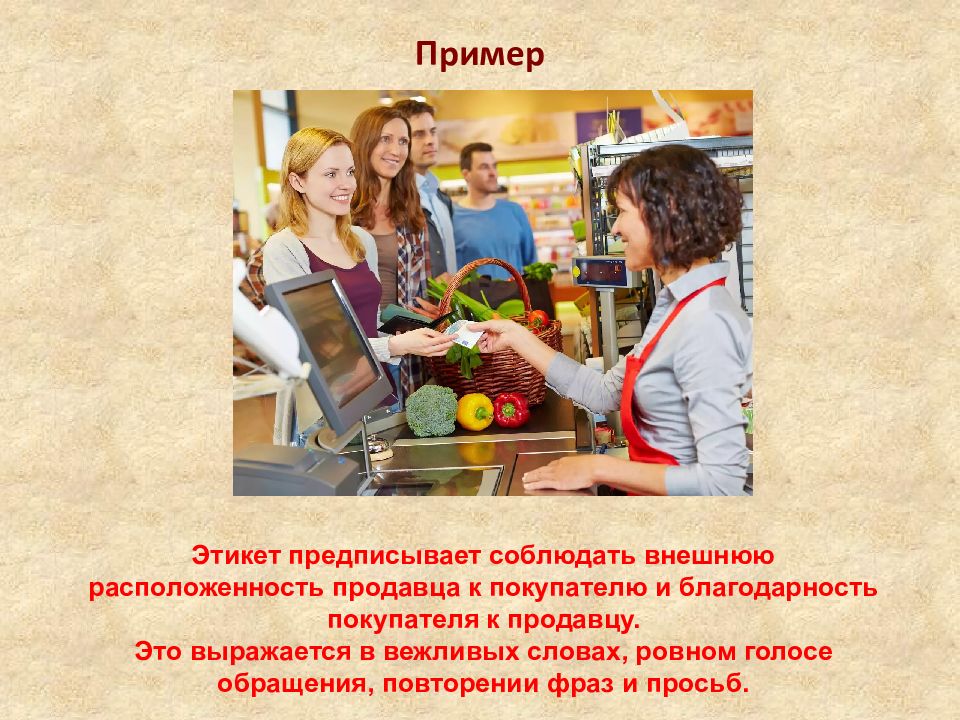 Пример Этикет предписывает соблюдать внешнюю расположенность продавца к покупателю и благодарность покупателя к продавцу. Это выражается в вежливых словах, ровном голосе обращения, повторении фраз и просьб.