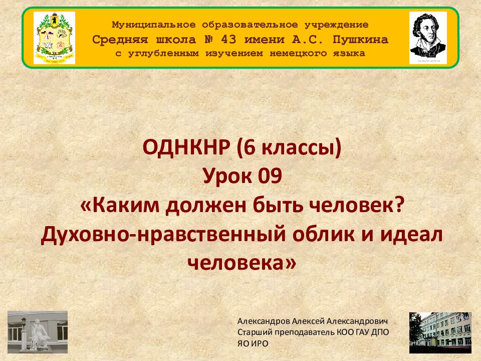 ОДНКНР (6 классы) Урок 09 «Каким должен быть человек? Духовно-нравственный облик и идеал человека» Александров Алексей Александрович Старший преподаватель КОО ГАУ ДПО ЯО ИРО Муниципальное образовательное учреждение Средняя школа № 43 имени А.С. Пушкина с углубленным изучением немецкого языка