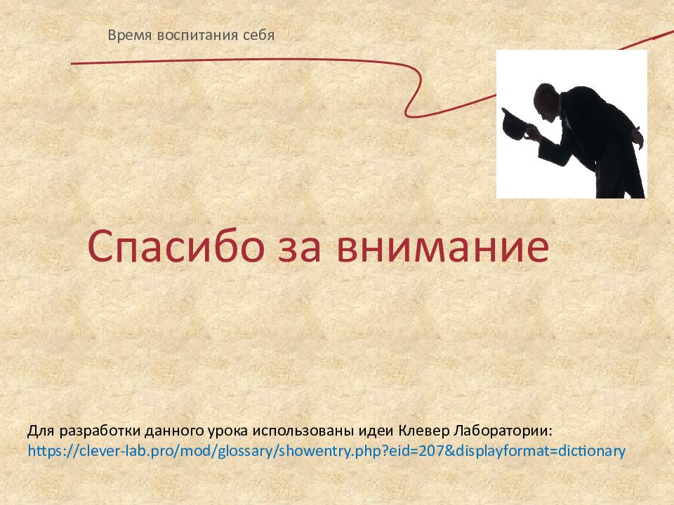 Время воспитания себя Спасибо за внимание Для разработки данного урока использованы идеи Клевер Лаборатории: https://clever-lab.pro/mod/glossary/showentry.php?eid=207&displayformat=dictionary