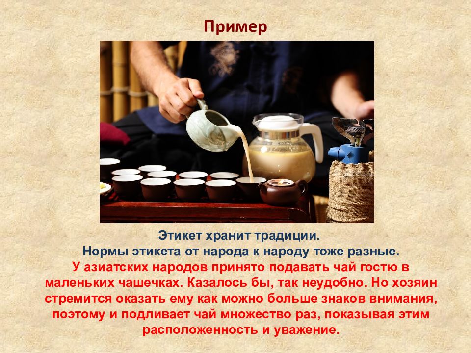 Пример Этикет хранит традиции. Нормы этикета от народа к народу тоже разные. У азиатских народов принято подавать чай гостю в маленьких чашечках. Казалось бы, так неудобно. Но хозяин стремится оказать ему как можно больше знаков внимания, поэтому и подливает чай множество раз, показывая этим расположенность и уважение.