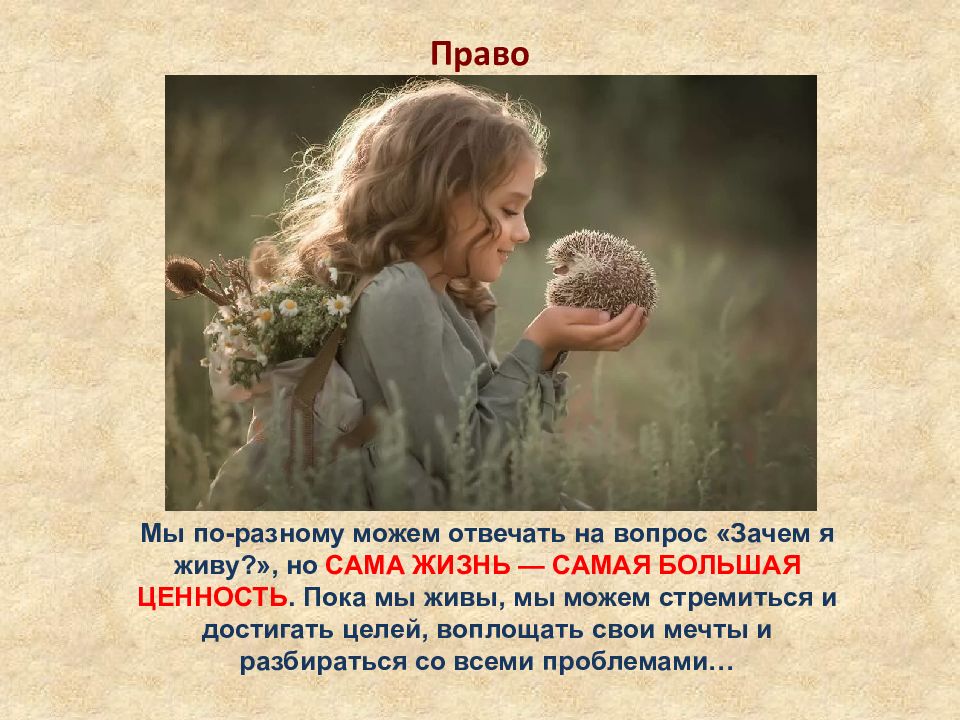 Право Мы по-разному можем отвечать на вопрос «Зачем я живу?», но САМА ЖИЗНЬ — САМАЯ БОЛЬШАЯ ЦЕННОСТЬ. Пока мы живы, мы можем стремиться и достигать целей, воплощать свои мечты и разбираться со всеми проблемами…