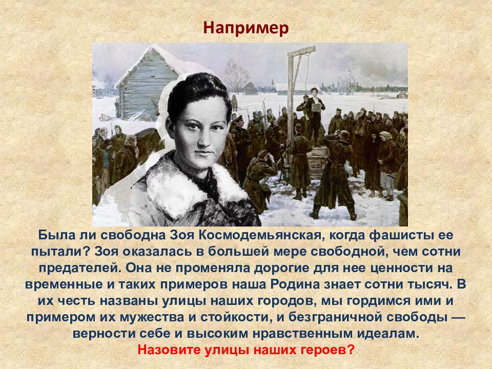 Например Была ли свободна Зоя Космодемьянская, когда фашисты ее пытали? Зоя оказалась в большей мере свободной, чем сотни предателей. Она не променяла дорогие для нее ценности на временные и таких примеров наша Родина знает сотни тысяч. В их честь названы улицы наших городов, мы гордимся ими и примером их мужества и стойкости, и безграничной свободы — верности себе и высоким нравственным идеалам. Назовите улицы наших героев?