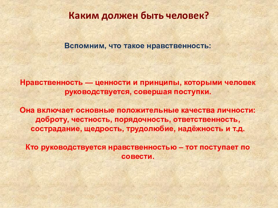 Каким должен быть человек? Вспомним, что такое нравственность: Нравственность — ценности и принципы, которыми человек руководствуется, совершая поступки. Она включает основные положительные качества личности: доброту, честность, порядочность, ответственность, сострадание, щедрость, трудолюбие, надёжность и т.д. Кто руководствуется нравственностью – тот поступает по совести.