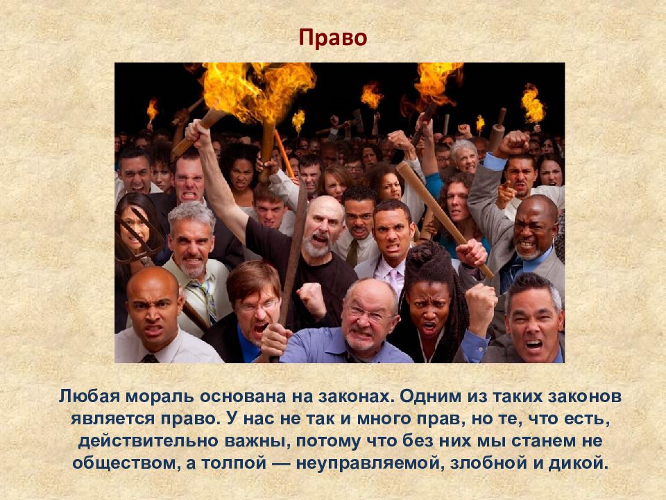 Право Любая мораль основана на законах. Одним из таких законов является право. У нас не так и много прав, но те, что есть, действительно важны, потому что без них мы станем не обществом, а толпой — неуправляемой, злобной и дикой.