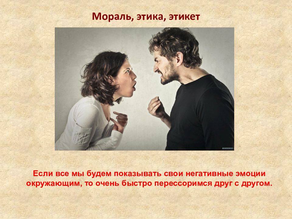 Мораль, этика, этикет Если все мы будем показывать свои негативные эмоции окружающим, то очень быстро перессоримся друг с другом.