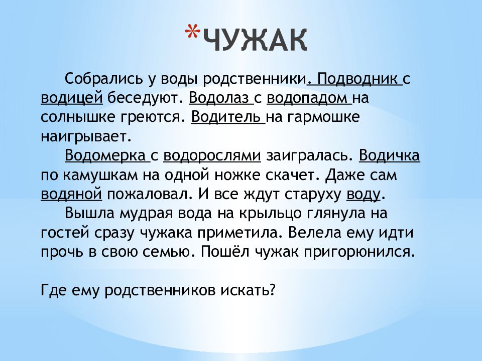Собрались у воды родственники. Подводник с водицей беседуют. Водолаз с водопадом на солнышке греются. Водитель на гармошке наигрывает. В одомерка с водорослями заигралась. Водичка по камушкам на одной ножке скачет. Даже сам водяной пожаловал. И все ждут старуху воду. Вышла мудрая вода на крыльцо глянула на гостей сразу чужака приметила. Велела ему идти прочь в свою семью. Пошёл чужак пригорюнился. Где ему родственников искать?