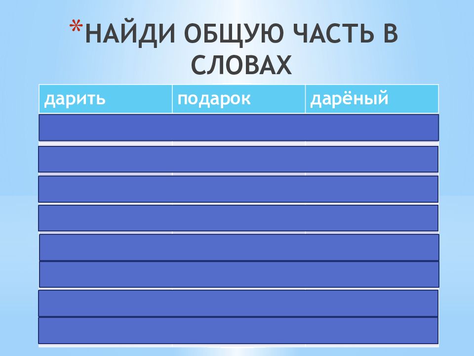 Слайд 2: НАЙДИ ОБЩУЮ ЧАСТЬ В СЛОВАХ