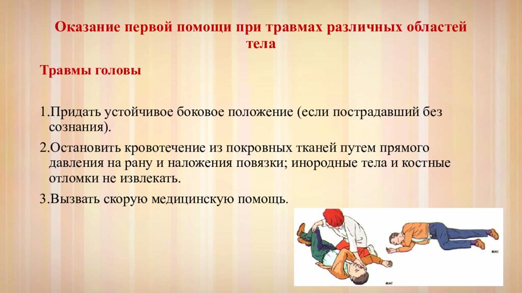 Травмы головы Придать устойчивое боковое положение (если пострадавший без сознания). Остановить кровотечение из покровных тканей путем прямого давления на рану и наложения повязки; инородные тела и костные отломки не извлекать. Вызвать скорую медицинскую помощь.