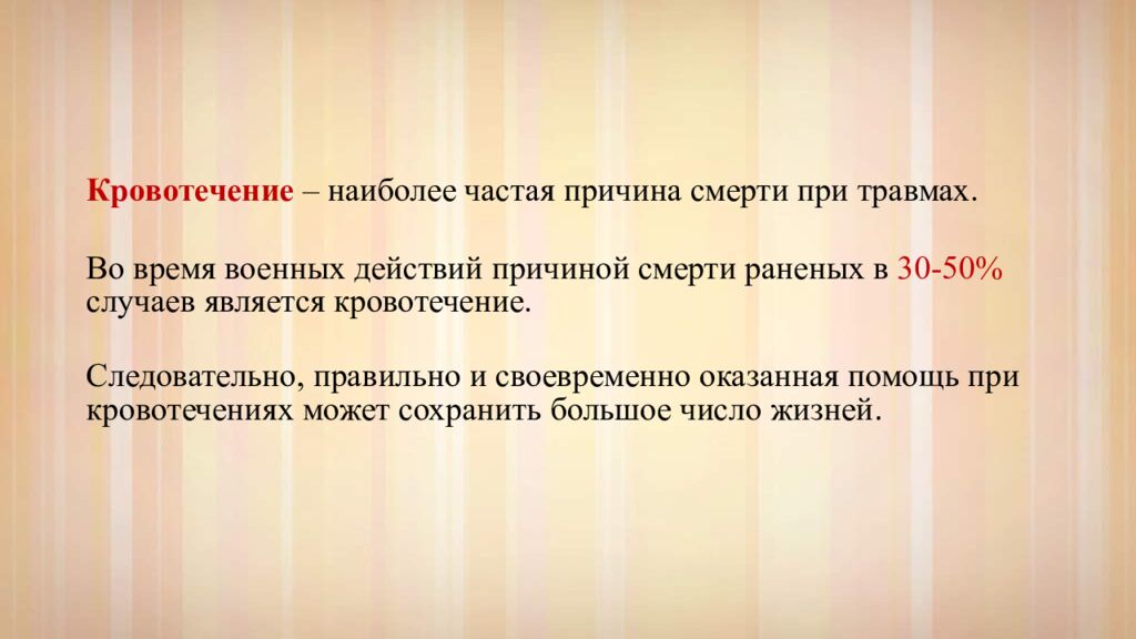 Кровотечение – наиболее частая причина смерти при травмах. Во время военных действий причиной смерти раненых в 30-50% случаев является кровотечение. Следовательно, правильно и своевременно оказанная помощь при кровотечениях может сохранить большое число жизней.