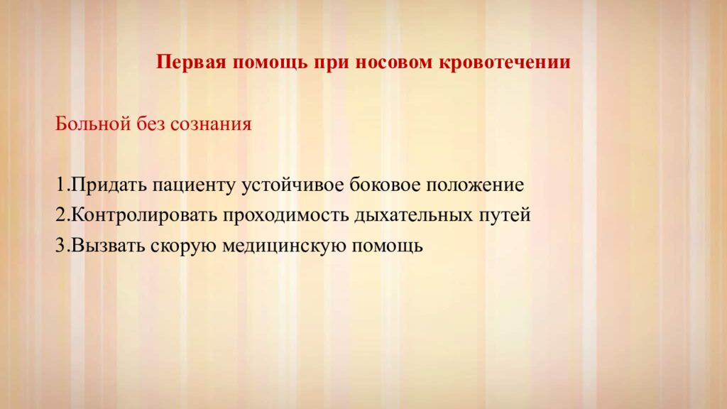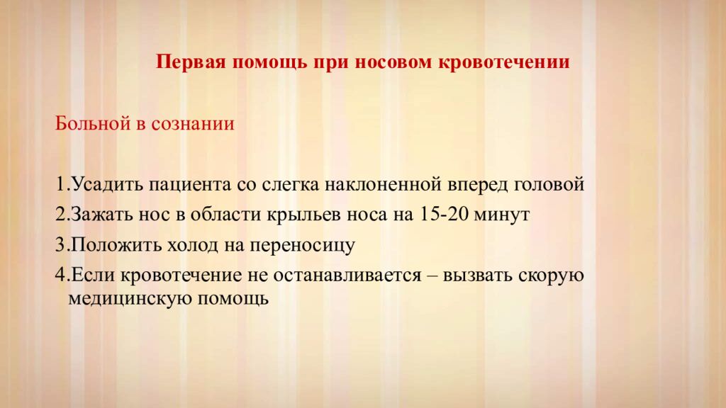 Больной в сознании Усадить пациента со слегка наклоненной вперед головой Зажать нос в области крыльев носа на 15-20 минут Положить холод на переносицу Если кровотечение не останавливается – вызвать скорую медицинскую помощь