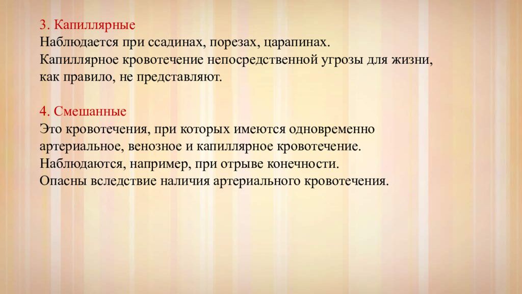 3. Капиллярные Наблюдается при ссадинах, порезах, царапинах. Капиллярное кровотечение непосредственной угрозы для жизни, как правило, не представляют. 4. Смешанные Это кровотечения, при которых имеются одновременно артериальное, венозное и капиллярное кровотечение. Наблюдаются, например, при отрыве конечности. Опасны вследствие наличия артериального кровотечения.