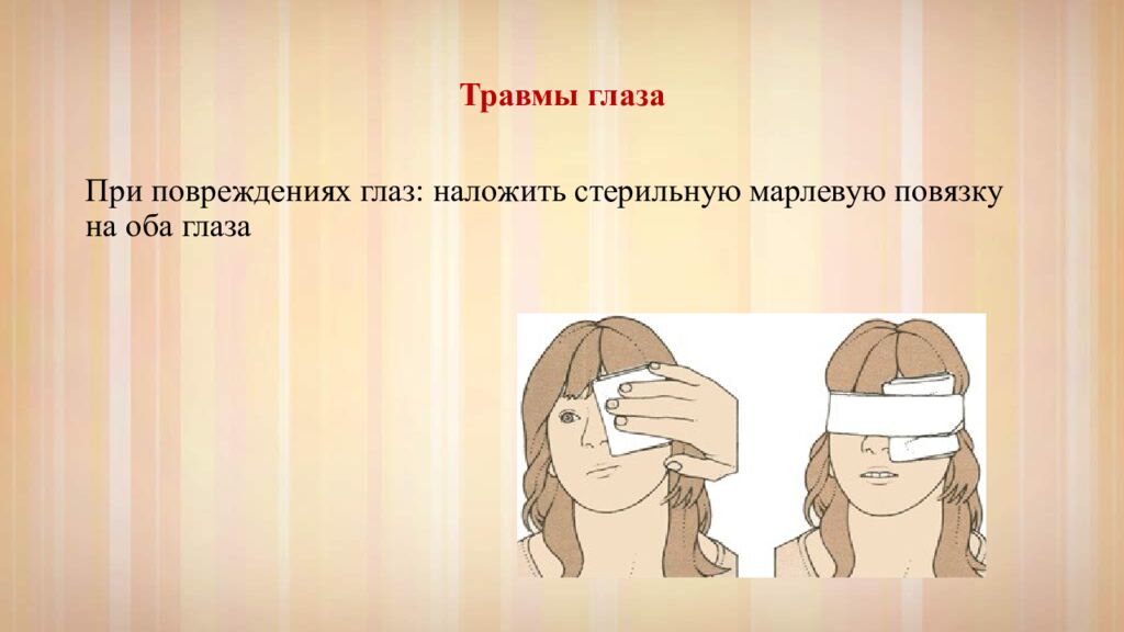 При повреждениях глаз: наложить стерильную марлевую повязку на оба глаза