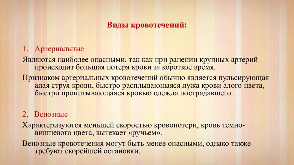 Артериальные Являются наиболее опасными, так как при ранении крупных артерий происходит большая потеря крови за короткое время. Признаком артериальных кровотечений обычно является пульсирующая алая струя крови, быстро расплывающаяся лужа крови алого цвета, быстро пропитывающаяся кровью одежда пострадавшего. 2. Венозные Характеризуются меньшей скоростью кровопотери, кровь темно-вишневого цвета, вытекает «ручьем». Венозные кровотечения могут быть менее опасными, однако также требуют скорейшей остановки.