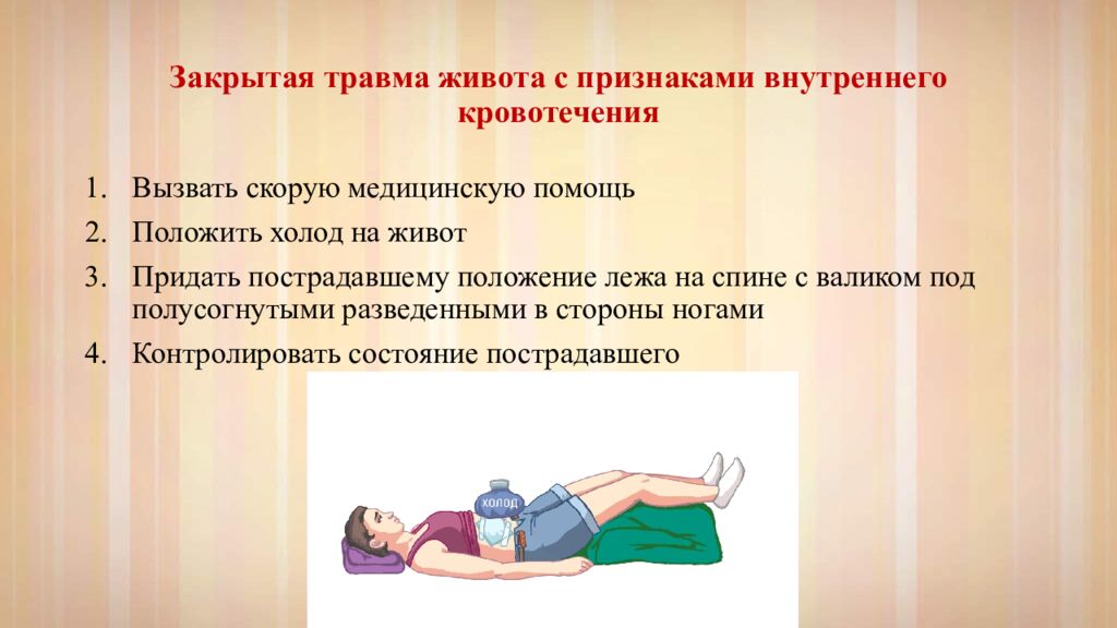 Вызвать скорую медицинскую помощь Положить холод на живот Придать пострадавшему положение лежа на спине с валиком под полусогнутыми разведенными в стороны ногами Контролировать состояние пострадавшего