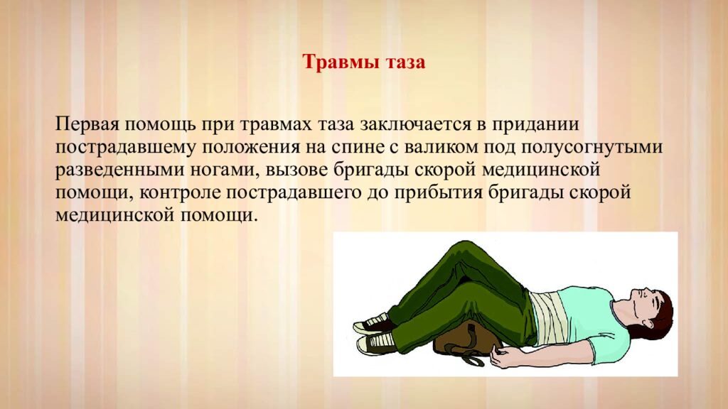 Первая помощь при травмах таза заключается в придании пострадавшему положения на спине с валиком под полусогнутыми разведенными ногами, вызове бригады скорой медицинской помощи, контроле пострадавшего до прибытия бригады скорой медицинской помощи.