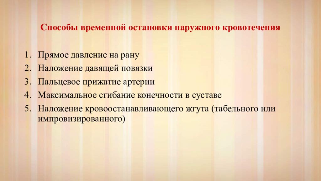 Прямое давление на рану Наложение давящей повязки Пальцевое прижатие артерии Максимальное сгибание конечности в суставе Наложение кровоостанавливающего жгута (табельного или импровизированного)