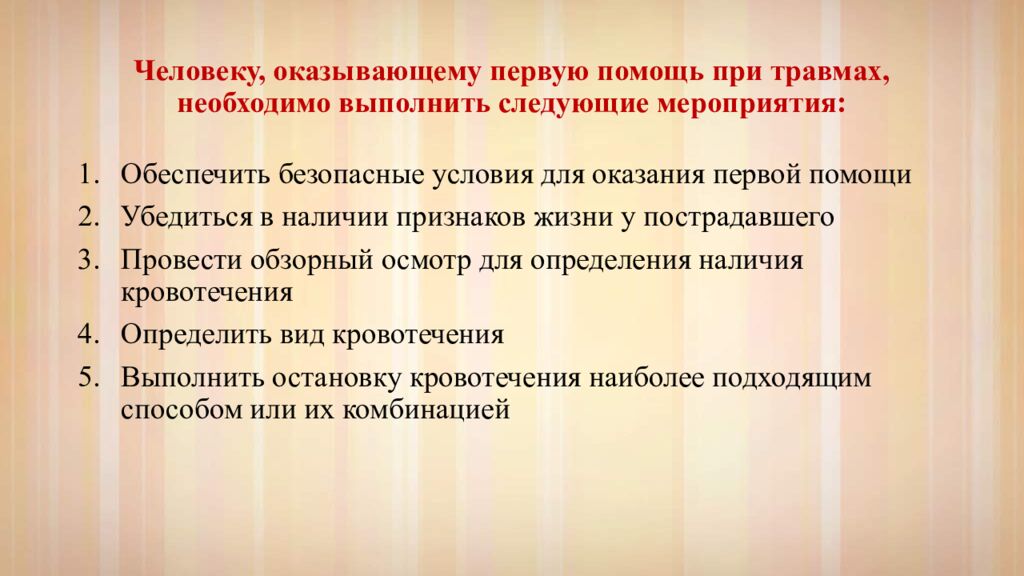 Слайд 5: Человеку, оказывающему первую помощь при травмах, необходимо выполнить следующие мероприятия: