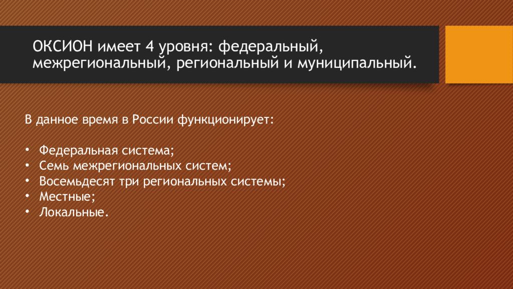 Слайд 5: ОКСИОН имеет 4 уровня: федеральный, межрегиональный, региональный и муниципальный