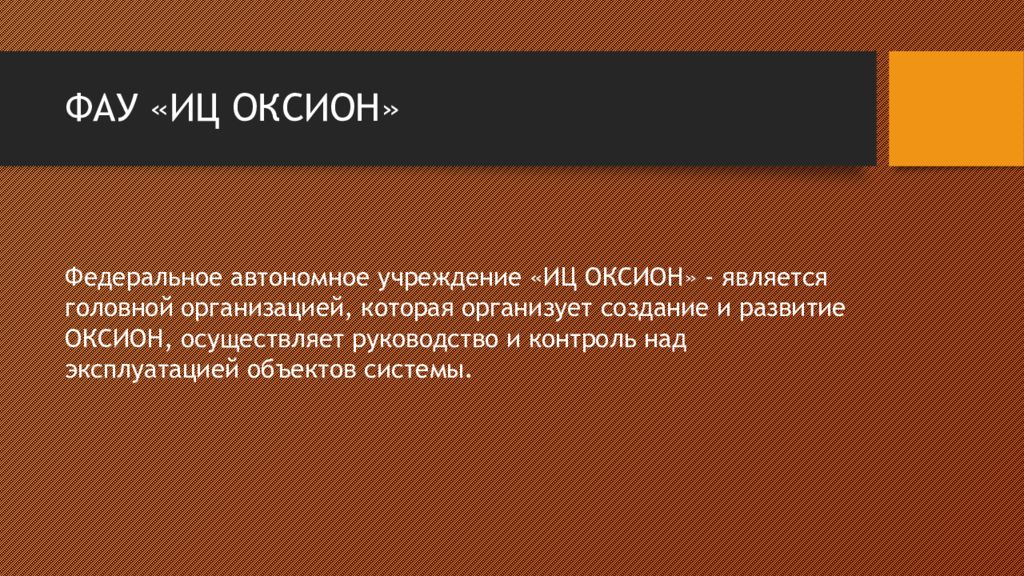 Федеральное автономное учреждение «ИЦ ОКСИОН» - является головной организацией, которая организует создание и развитие ОКСИОН, осуществляет руководство и контроль над эксплуатацией объектов системы.