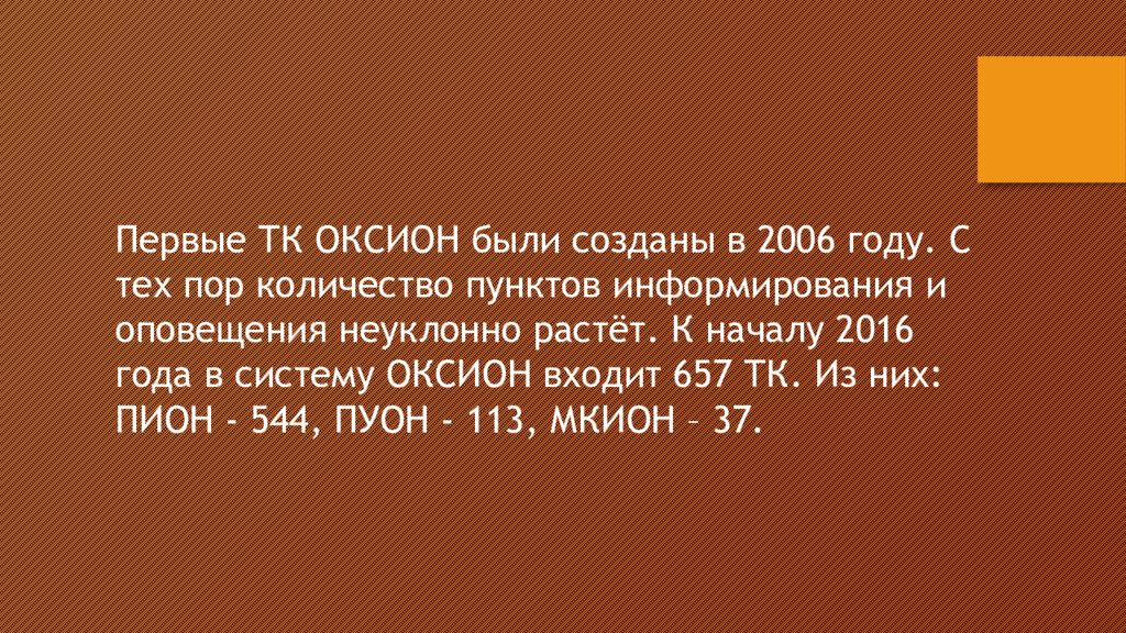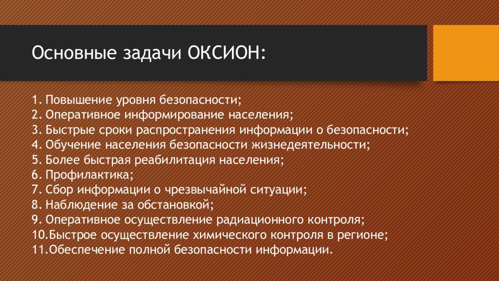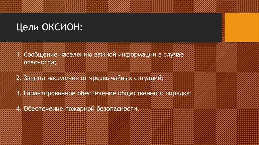 ОКСИОН обеспечивает в общественных местах и местах массового пребывания людей при угрозе возникновения и возникновении чрезвычайных ситуаций информирование и оповещение населения, а в режиме повседневной деятельности - его обучение по вопросам безопасности жизнедеятельности.