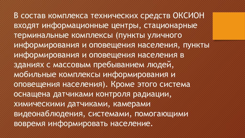 В состав комплекса технических средств ОКСИОН входят информационные центры, стационарные терминальные комплексы (пункты уличного информирования и оповещения населения, пункты информирования и оповещения населения в зданиях с массовым пребыванием людей, мобильные комплексы информирования и оповещения населения). Кроме этого система оснащена датчиками контроля радиации, химическими датчиками, камерами видеонаблюдения, системами, помогающими вовремя информировать население.