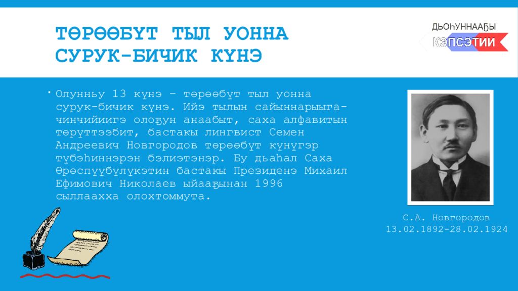 Олунньу 13 күнэ – төрөөбүт тыл уонна сурук-бичик күнэ. Ийэ тылын сайыннарыыга-чинчийиигэ олоҕун анаабыт, саха алфавитын төрүттээбит, бастакы лингвист Семен Андреевич Новгородов төрөөбүт күнүгэр түбэhиннэрэн бэлиэтэнэр. Бу дьаhал Саха Өрөспүүбүлүкэтин бастакы Президенэ Михаил Ефимович Николаев ыйааҕынан 1996 сыллаахха олохтоммута. С.А. Новгородов 13.02.1892-28.02.1924
