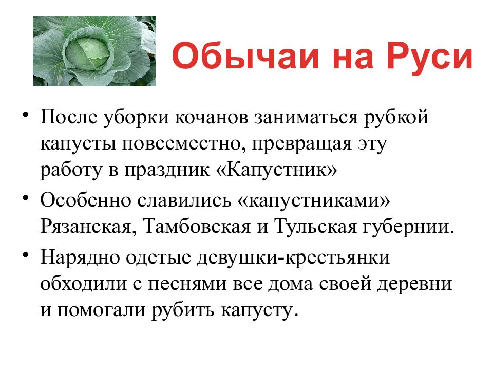 После уборки кочанов заниматься рубкой капусты повсеместно, превращая эту работу в праздник «Капустник» Особенно славились «капустниками» Рязанская, Тамбовская и Тульская губернии. Нарядно одетые девушки-крестьянки обходили с песнями все дома своей деревни и помогали рубить капусту. Обычаи на Руси