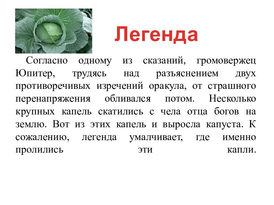 Согласно одному из сказаний, громовержец Юпитер, трудясь над разъяснением двух противоречивых изречений оракула, от страшного перенапряжения обливался потом. Несколько крупных капель скатились с чела отца богов на землю. Вот из этих капель и выросла капуста. К сожалению, легенда умалчивает, где именно пролились эти капли. Легенда