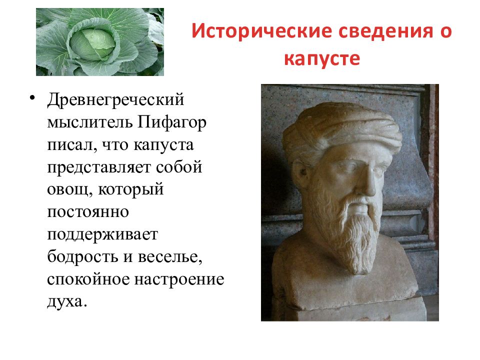 Древнегреческий мыслитель Пифагор писал, что капуста представляет собой овощ, который постоянно поддерживает бодрость и веселье, спокойное настроение духа.
