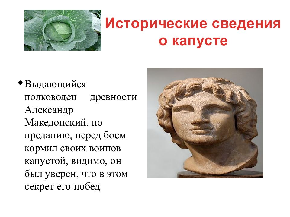 Выдающийся полководец древности Александр Македонский, по преданию, перед боем кормил своих воинов капустой, видимо, он был уверен, что в этом секрет его побед Исторические сведения о капусте