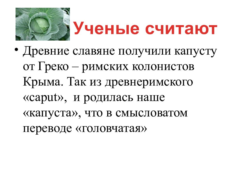 Древние славяне получили капусту от Греко – римских колонистов Крыма. Так из древнеримского «caput», и родилась наше «капуста», что в смысловатом переводе «головчатая» Ученые считают
