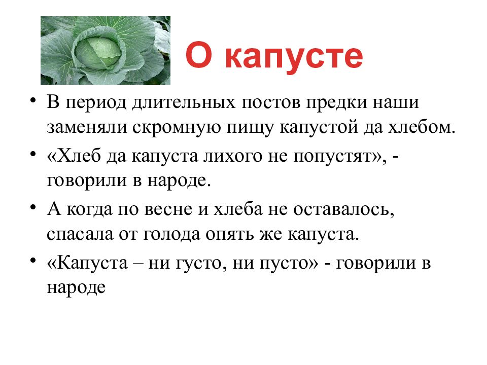 В период длительных постов предки наши заменяли скромную пищу капустой да хлебом. «Хлеб да капуста лихого не попустят», - говорили в народе. А когда по весне и хлеба не оставалось, спасала от голода опять же капуста. «Капуста – ни густо, ни пусто» - говорили в народе О капусте