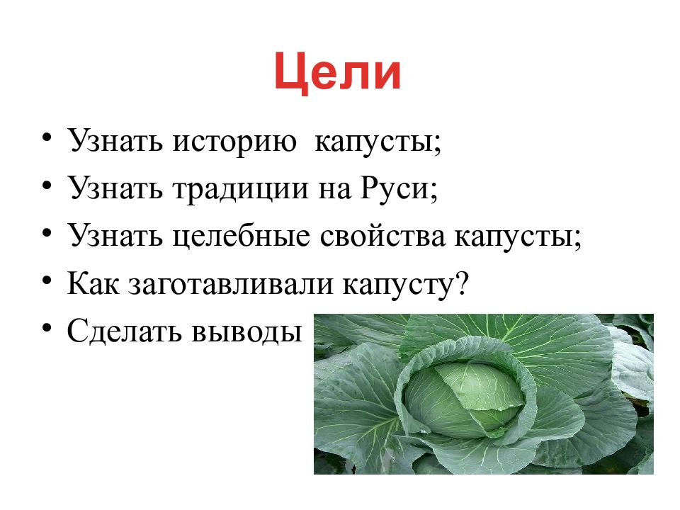 Узнать историю капусты; Узнать традиции на Руси; Узнать целебные свойства капусты; Как заготавливали капусту? Сделать выводы Цели