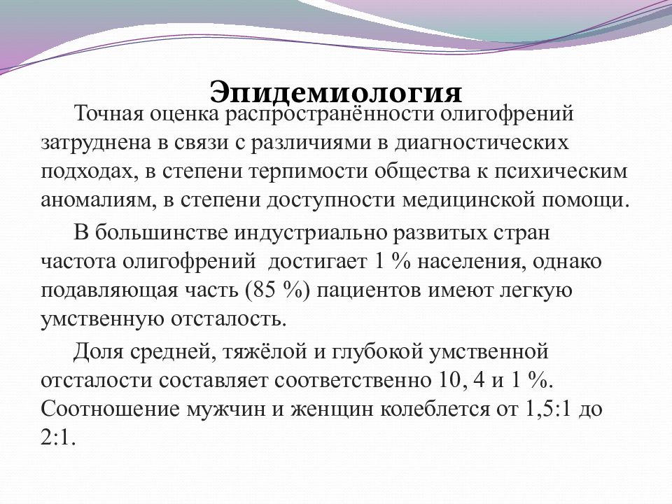 Точная оценка распространённости олигофрений затруднена в связи с различиями в диагностических подходах, в степени терпимости общества к психическим аномалиям, в степени доступности медицинской помощи. В большинстве индустриально развитых стран частота олигофрений достигает 1 % населения, однако подавляющая часть (85 %) пациентов имеют легкую умственную отсталость. Доля средней, тяжёлой и глубокой умственной отсталости составляет соответственно 10, 4 и 1 %. Соотношение мужчин и женщин колеблется от 1,5:1 до 2:1.