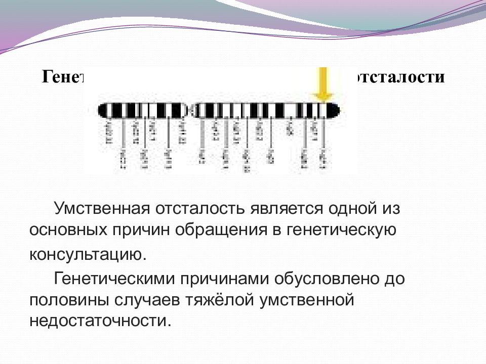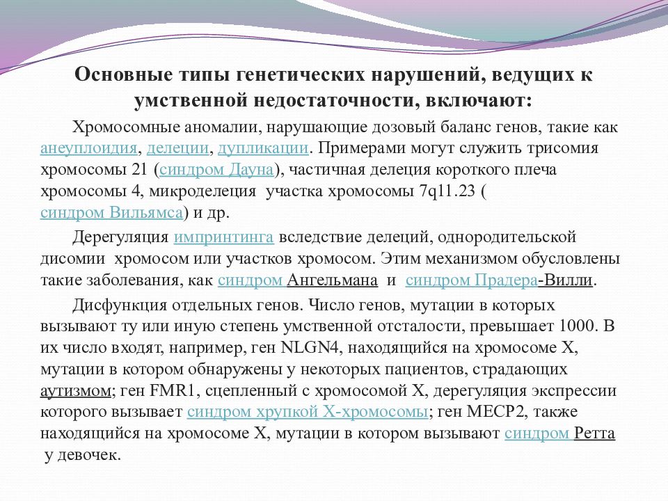 Основные типы генетических нарушений, ведущих к умственной недостаточности, включают: Хромосомные аномалии, нарушающие дозовый баланс генов, такие как анеуплоидия, делеции, дупликации. Примерами могут служить трисомия хромосомы 21 ( синдром Дауна ), частичная делеция короткого плеча хромосомы 4, микроделеция участка хромосомы 7q11.23 ( синдром Вильямса ) и др. Дерегуляция импринтинга вследствие делеций, однородительской дисомии хромосом или участков хромосом. Этим механизмом обусловлены такие заболевания, как синдром Ангельмана и синдром Прадера -Вилли. Дисфункция отдельных генов. Число генов, мутации в которых вызывают ту или иную степень умственной отсталости, превышает 1000. В их число входят, например, ген NLGN4, находящийся на хромосоме Х, мутации в котором обнаружены у некоторых пациентов, страдающих аутизмом ; ген FMR1, сцепленный с хромосомой Х, дерегуляция экспрессии которого вызывает синдром хрупкой Х-хромосомы ; ген MECP2, также находящийся на хромосоме Х, мутации в котором вызывают синдром Ретта у девочек.