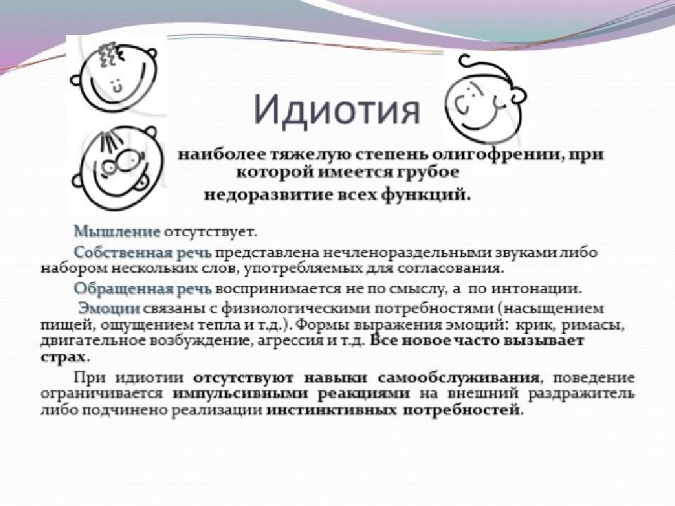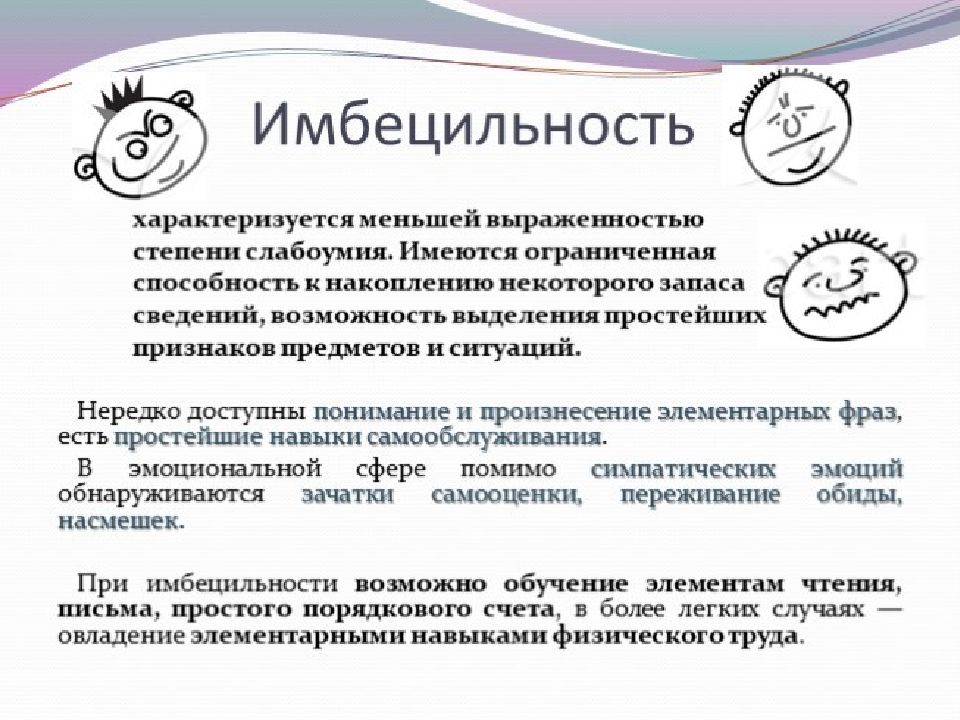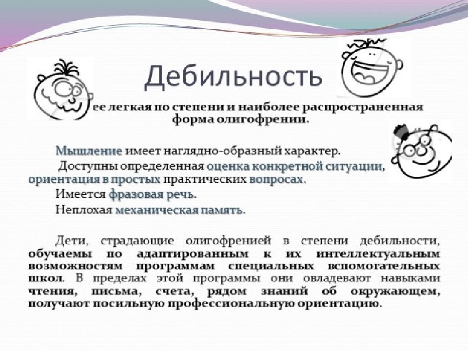 При одной и той же причине тяжесть нарушений может быть различна. На сегодняшний день по Международной классификации болезней выделяют 4 степени умственной отсталости. Согласно традиционной классификации существует 3 её степени: дебильность, имбецильность и идиотия. Термины «дебильность», « имбецильность » и « идиотия » полностью исключены из Международной классификации болезней. Это сделано в связи с тем, что они вышли за сугубо медицинские рамки, стали играть социальный ( негативный) оттенок. Вместо них предложено использовать исключительно нейтральные термины, количественно отражающие степень умственной отсталости : Лёгкая — соответствует традиционному понятию дебильность Умеренная — имбецильность Тяжёлая — имбецильность Глубокая — идиотия