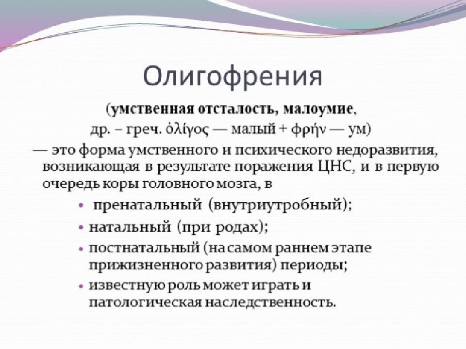Возможные причины: - Генетические; - Внутриутробное поражение плода нейротоксическими факторами физической ( ионизирующее излучение ), химической или инфекционной ( цитомегаловирус, сифилис и др.) природы; - Значительная недоношенность ; - Нарушения в процессе родов ( асфиксия, родовая травма ); - Травмы головы, гипоксия головного мозга, инфекции с поражением центральной нервной системы; - Педагогическая запущенность в первые годы жизни у детей из неблагополучных семей. - Умственная отсталость неясной этиологии.