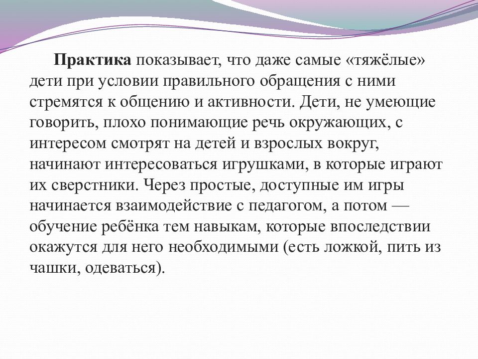 Практика показывает, что даже самые «тяжёлые» дети при условии правильного обращения с ними стремятся к общению и активности. Дети, не умеющие говорить, плохо понимающие речь окружающих, с интересом смотрят на детей и взрослых вокруг, начинают интересоваться игрушками, в которые играют их сверстники. Через простые, доступные им игры начинается взаимодействие с педагогом, а потом — обучение ребёнка тем навыкам, которые впоследствии окажутся для него необходимыми (есть ложкой, пить из чашки, одеваться).