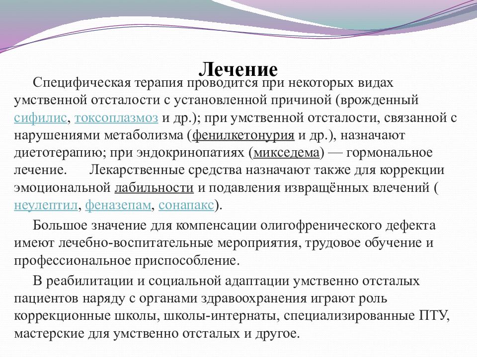 Специфическая терапия проводится при некоторых видах умственной отсталости с установленной причиной (врожденный сифилис, токсоплазмоз и др.); при умственной отсталости, связанной с нарушениями метаболизма ( фенилкетонурия и др.), назначают диетотерапию; при эндокринопатиях ( микседема ) — гормональное лечение. Лекарственные средства назначают также для коррекции эмоциональной лабильности и подавления извращённых влечений ( неулептил, феназепам, сонапакс ). Большое значение для компенсации олигофренического дефекта имеют лечебно-воспитательные мероприятия, трудовое обучение и профессиональное приспособление. В реабилитации и социальной адаптации умственно отсталых пациентов наряду с органами здравоохранения играют роль коррекционные школы, школы-интернаты, специализированные ПТУ, мастерские для умственно отсталых и другое.