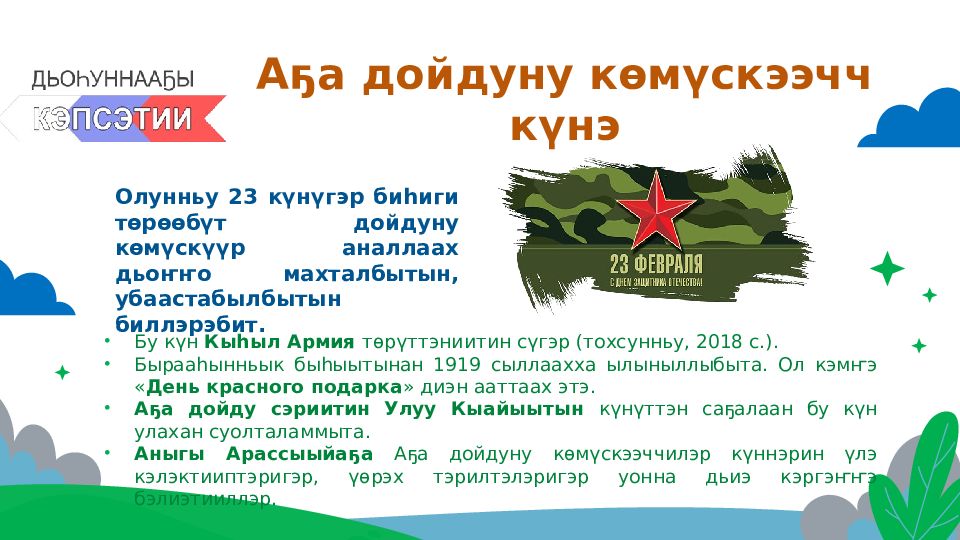 Бу күн Кыһыл Армия төрүттэниитин сүгэр (тохсунньу, 2018 с.). Бырааһынньык быһыытынан 1919 сыллаахха ылыныллыбыта. Ол кэмҥэ « День красного подарка » диэн ааттаах этэ. Аҕа дойду сэриитин Улуу Кыайыытын күнүттэн саҕалаан бу күн улахан суолталаммыта. Аныгы Арассыыйаҕа Аҕа дойдуну көмүскээччилэр күннэрин үлэ кэлэктииптэригэр, үөрэх тэрилтэлэригэр уонна дьиэ кэргэҥҥэ бэлиэтииллэр. Олунньу 23 күнүгэр биһиги төрөөбүт дойдуну көмүскүүр аналлаах дьоҥҥо махталбытын, убаастабылбытын биллэрэбит.