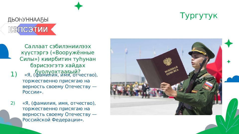 Саллаат сэбилэниилээх күүстэргэ («Вооружённые Силы») киирбитин туһунан бэрисээгэтэ хайдах буолуохтааҕый? «Я, (фамилия, имя, отчество), торжественно присягаю на верность своему Отечеству — России». «Я, (фамилия, имя, отчество), торжественно присягаю на верность своему Отечеству — Российской Федерации».