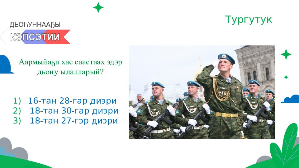 Аармыйаҕа хас саастаах эдэр дьону ылалларый? 16-тан 28-гар диэри 18-тан 30-гар диэри 18-тан 27-гэр диэри