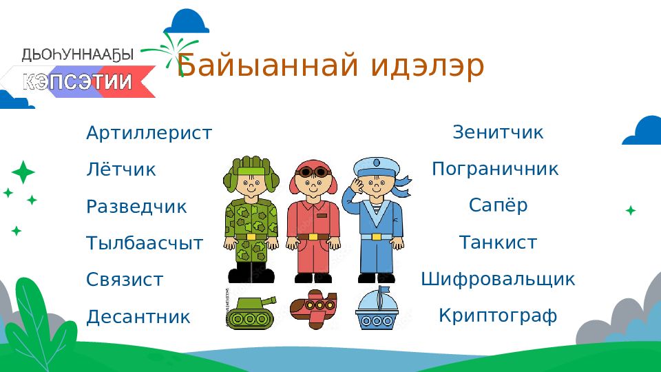 Артиллерист Лётчик Разведчик Тылбаасчыт Связист Десантник Зенитчик Пограничник Сапёр Танкист Шифровальщик Криптограф