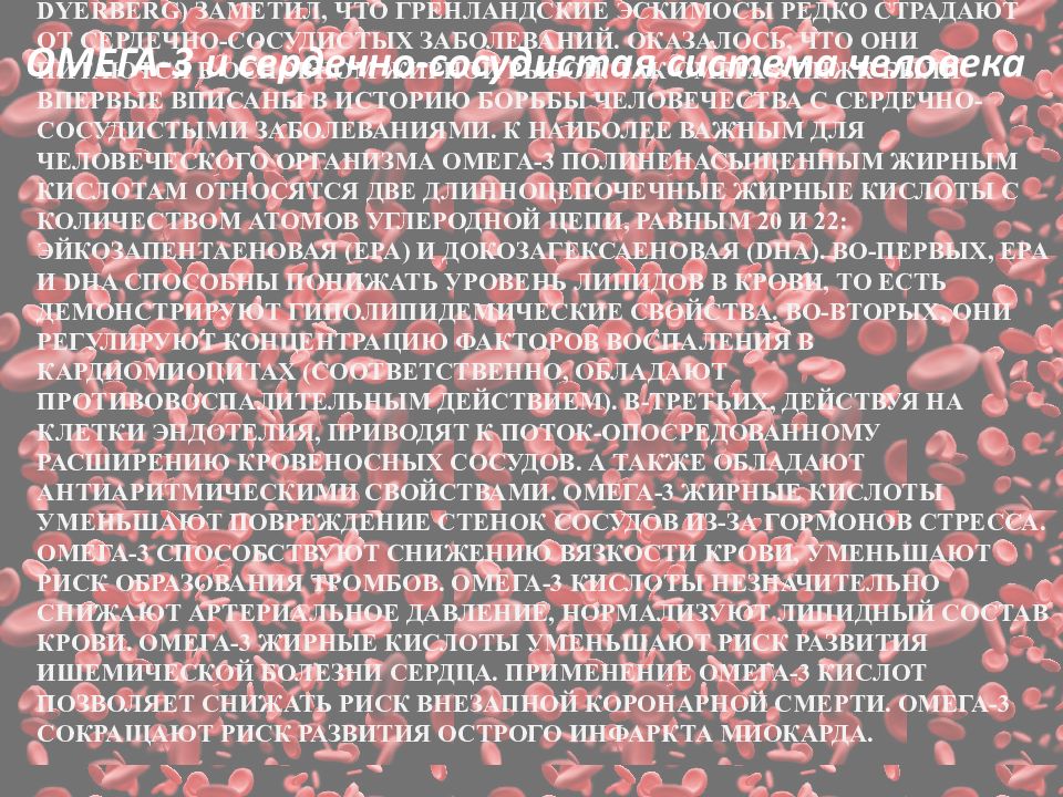 Ещё в начале 1970-х годов датский врач Йорн Дуерберг ( Jorn Dyerberg ) заметил, что гренландские эскимосы редко страдают от сердечно-сосудистых заболеваний. Оказалось, что они питаются в основном жирной рыбой. Так Омега-3 ПНЖК были впервые вписаны в историю борьбы человечества с сердечно-сосудистыми заболеваниями. К наиболее важным для человеческого организма Омега-3 полиненасыщенным жирным кислотам относятся две длинноцепочечные жирные кислоты с количеством атомов углеродной цепи, равным 20 и 22: эйкозапентаеновая (ЕPA) и докозагексаеновая (DHA). Во-первых, EPA и DHA способны понижать уровень липидов в крови, то есть демонстрируют гиполипидемические свойства. Во-вторых, они регулируют концентрацию факторов воспаления в кардиомиоцитах (соответственно, обладают противовоспалительным действием). В-третьих, действуя на клетки эндотелия, приводят к поток-опосредованному расширению кровеносных сосудов. А также обладают антиаритмическими свойствами. Омега-3 жирные кислоты уменьшают повреждение стенок сосудов из-за гормонов стресса. Омега-3 способствуют снижению вязкости крови, уменьшают риск образования тромбов. Омега-3 кислоты незначительно снижают артериальное давление, нормализуют липидный состав крови. Омега-3 жирные кислоты уменьшают риск развития ишемической болезни сердца. Применение Омега-3 кислот позволяет снижать риск внезапной коронарной смерти. Омега-3 сокращают риск развития острого инфаркта миокарда. ОМЕГА-3 и сердечно-сосудистая система человека