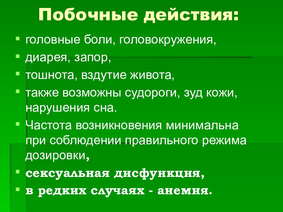 головные боли, головокружения, диарея, запор, тошнота, вздутие живота, также возможны судороги, зуд кожи, нарушения сна. Частота возникновения минимальна при соблюдении правильного режима дозировки, сексуальная дисфункция, в редких случаях - анемия.