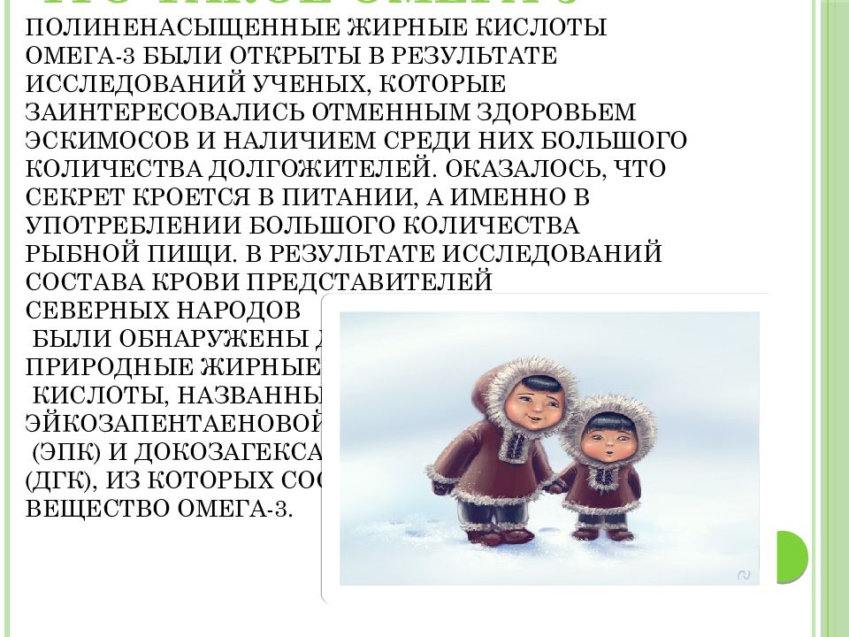 Слайд 2: Что такое Омега-3 Полиненасыщенные жирные кислоты Омега-3 были открыты в результате исследований ученых, которые заинтересовались отменным здоровьем эскимосов и наличием среди них большого количества долгожителей. Оказалось, что секрет кроется в питании, а именно в употреблении большого количества рыбной пищи. В результате исследований состава крови представителей северных народов были обнаружены две природные жирные кислоты, названные эйкозапентаеновой (ЭПК) и докозагексаеновой ( ДГК), из которых состоит вещество Омега-3