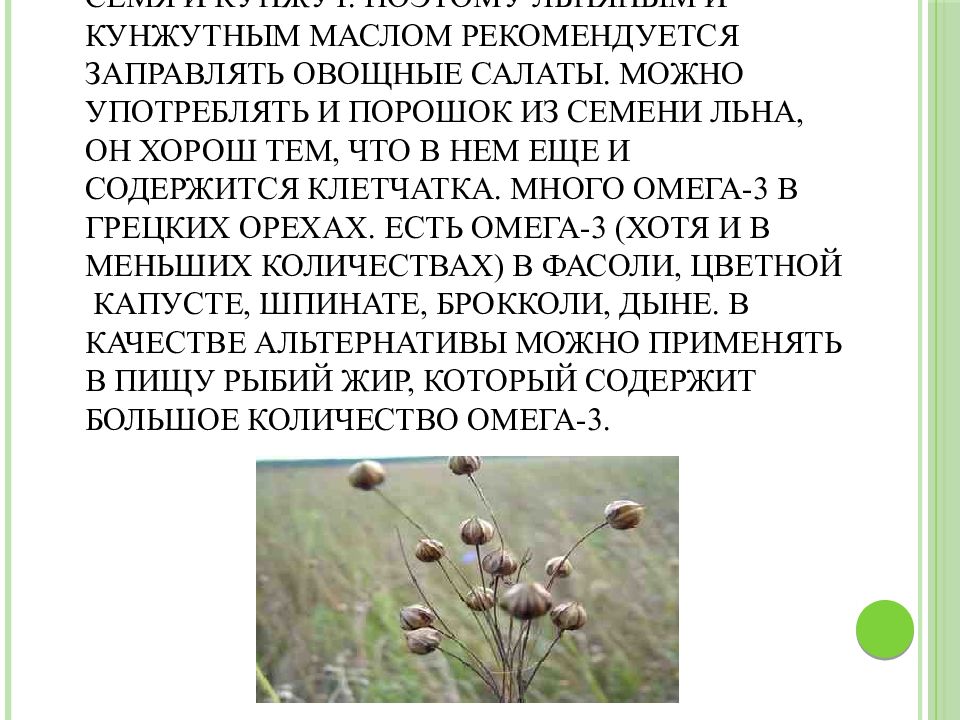 Слайд 8: Из растений наибольшим содержанием Омега-3 могут похвастаться льняное семя и кунжут. Поэтому льняным и кунжутным маслом рекомендуется заправлять овощные салаты. Можно употреблять и порошок из семени льна, он хорош тем, что в нем еще и содержится клетчатка. Много Омега-3 в грецких орехах. Есть Омега-3 (хотя и в меньших количествах) в фасоли, цветной капусте, шпинате, брокколи, дыне. В качестве альтернативы можно применять в пищу рыбий жир, который содержит большое количество Омега-3
