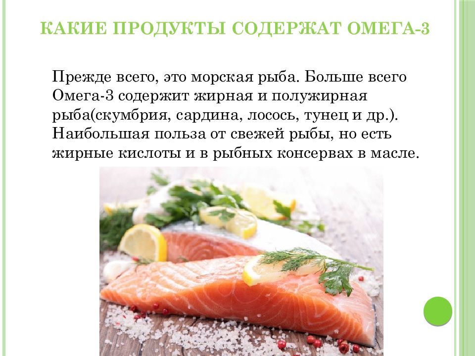Прежде всего, это морская рыба. Больше всего Омега-3 содержит жирная и полужирная рыба(скумбрия, сардина, лосось, тунец и др.). Наибольшая польза от свежей рыбы, но есть жирные кислоты и в рыбных консервах в масле.
