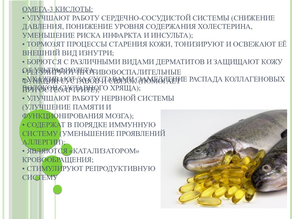 Слайд 4: Омега-3 кислоты: • улучшают работу сердечно-сосудистой системы (снижение давления, понижение уровня содержания холестерина, уменьшение риска инфаркта и инсульта); • тормозят процессы старения кожи, тонизируют и освежают её внешний вид изнутри; • борются с различными видами дерматитов и защищают кожу от ультрафиолета; • ухаживают за суставами (замедление распада коллагеновых волокон суставного хряща );