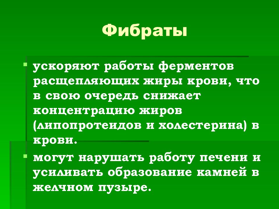 ускоряют работы ферментов расщепляющих жиры крови, что в свою очередь снижает концентрацию жиров (липопротеидов и холестерина) в крови. могут нарушать работу печени и усиливать образование камней в желчном пузыре.